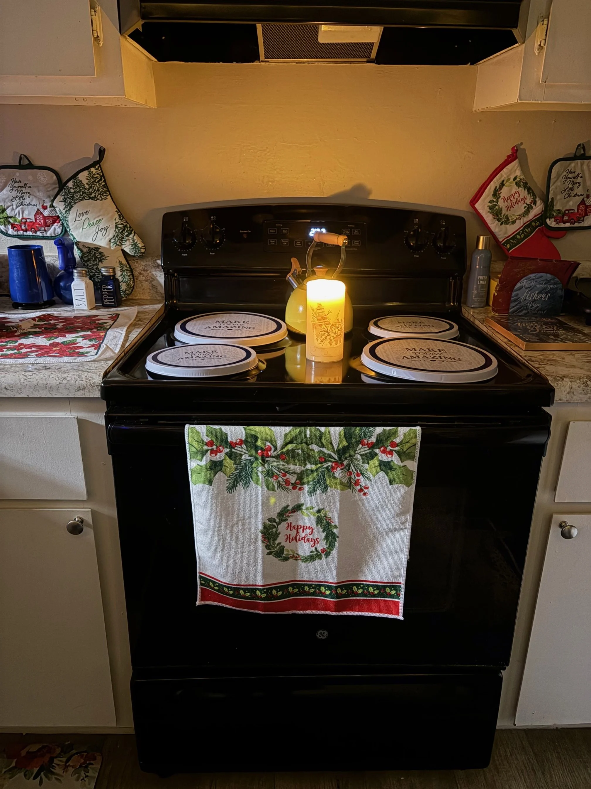 A single candle flickering on the stove.